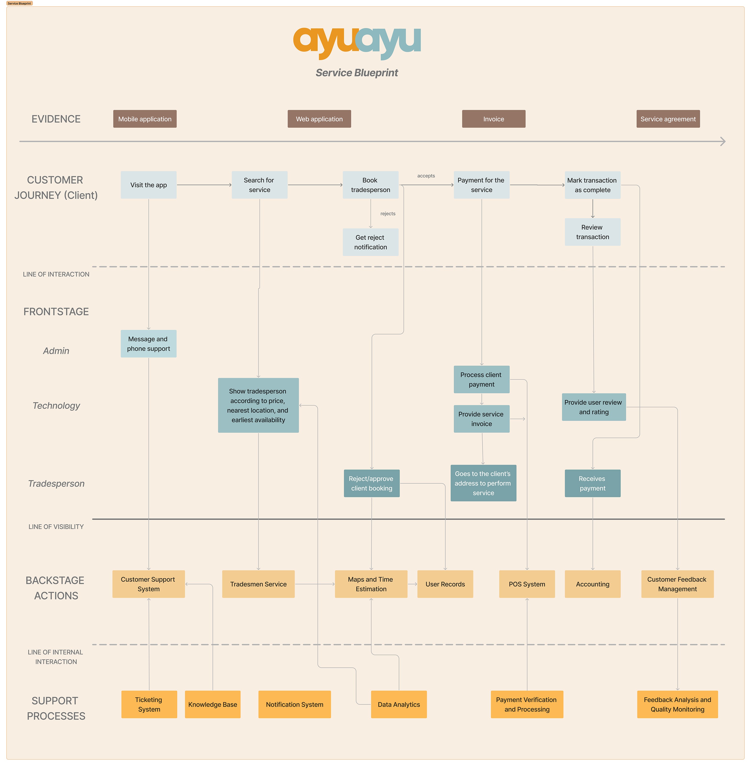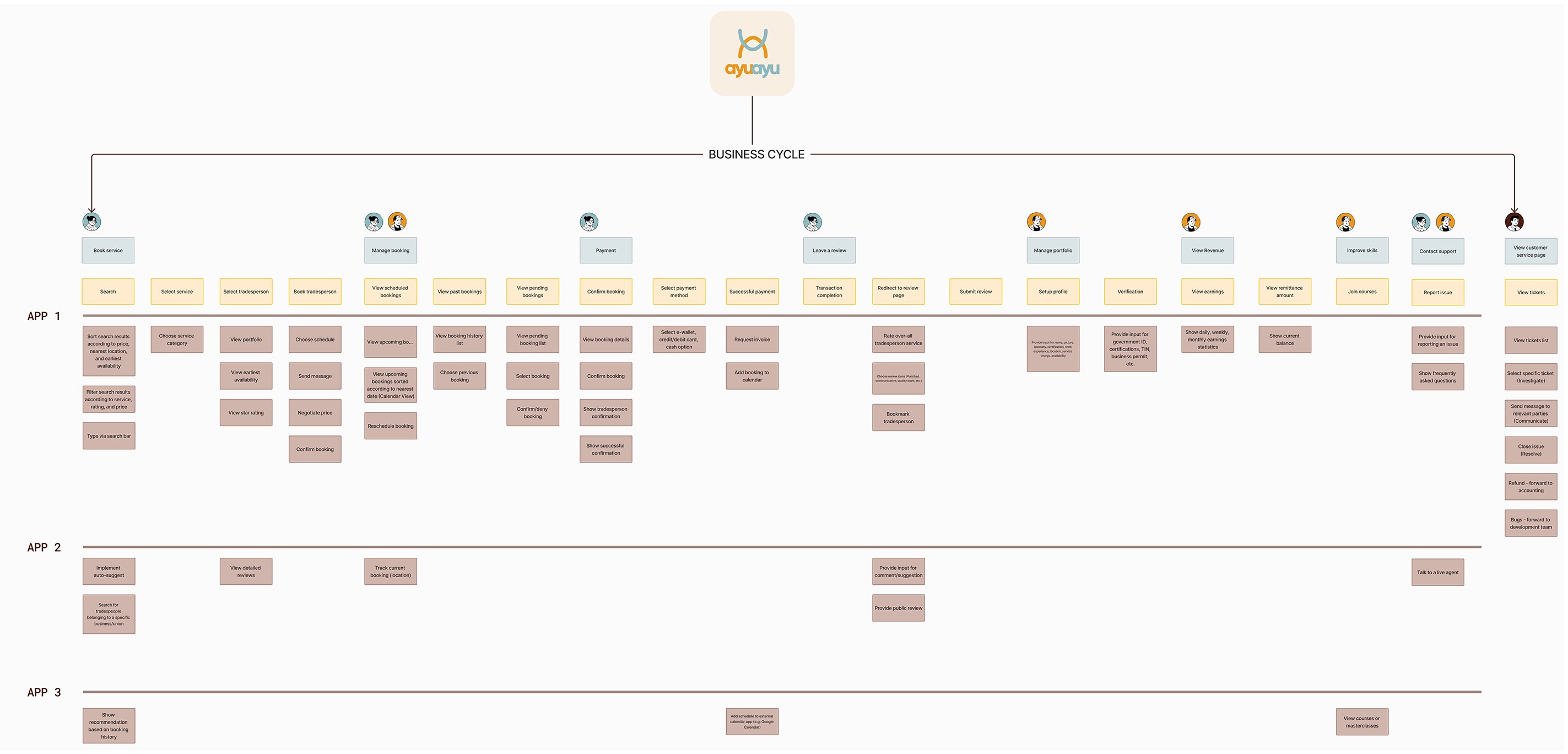 The product planning phase began with mapping AyuAyu’s service framework, outlining the customer journey, frontstage and backstage interactions, and support processes.